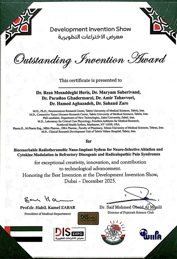 داوری اختراعات توسط یک هیئت بینالمللی چندرشتهای شامل استادان دانشگاه، فناوران، متخصصان مالکیت فکری و رهبران صنعتی، با رویکردی دقیق، شفاف و منصفانه صورت گرفت و اطمینان حاصل شد که تنها برترین اختراعات مورد تقدیر قرار گیرند، این در حالی بود که در این مسابقات ۲۳۰ تیم از ۳۰ کشور جهان در مسابقات بین المللی و تخصصی اختراعات و نوآوری های دبی DIS EXPO 2025 شرکت کرده بودند که در حوزه پزشکی و داروسازی رتبه اول جهانی را کسب کردیم. حامد آقازاده در توضیح این اختراع نوآورانه گفت: هدف این اختراع، طراحی و ارزیابی یک نانوایمپلنت رادیوتِرانوستیک زیستجذبپذیر است که برای تحویل کمتهاجمی تحت هدایت رادیولوژیک به دیسک بینمهرهای و بافتهای پیرامون اعصاب (پرینورال) مهندسی شده و قابلیت رویت در تصویربرداری PET/SPECT، نورومدولاسیون فوقموضعی با انتشاردهنده بتا با دوز پایین، و رهایش پایدار عوامل تعدیلکننده سایتوکاینها را در خود ادغام میکند. در این طرح، معماری تریفازیک نانوایمپلنت سنتز شد که شامل یک پوسته قابل رؤیت در تصویربرداری، لایهای حاوی رادیودارو با دوز پایینِ گسیلکننده بتا، و یک نانوماتریس ضدالتهابی زیستتخریبپذیر بود. این نانوایمپلنت رادیوتِرانوستیک زیستجذبپذیر، قابلیت بسیار هدفمند برای تعدیل همزمان منشأهای عصبی و زیستشیمیایی درد را نشان میدهد. یکپارچهسازی قابلیت تصویربرداری، نورومدولاسیون و مهار سایتوکاینها در این سامانه، یک پلتفرم درمانی غیرجراحی نوآورانه با پتانسیل انتقال بالینی قوی برای مدیریت گسترده درد دیسکوژنیک فراهم میکند.
